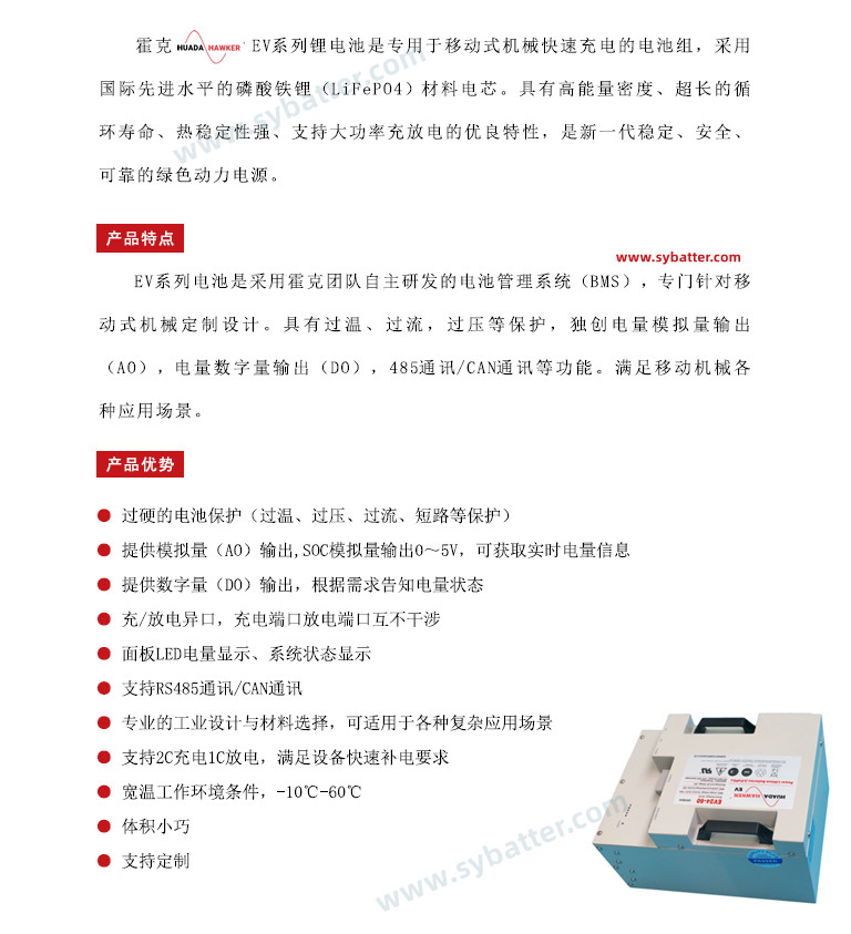 霍克 HAWKER EV系列動力電池,是先進水平的磷酸鐵鋰(LiFePO4)動力電池系統。具有能量密度高、循環壽命長、充放電性能優良、溫度性能好,是新一代高安全性、高可靠性的綠色電源。